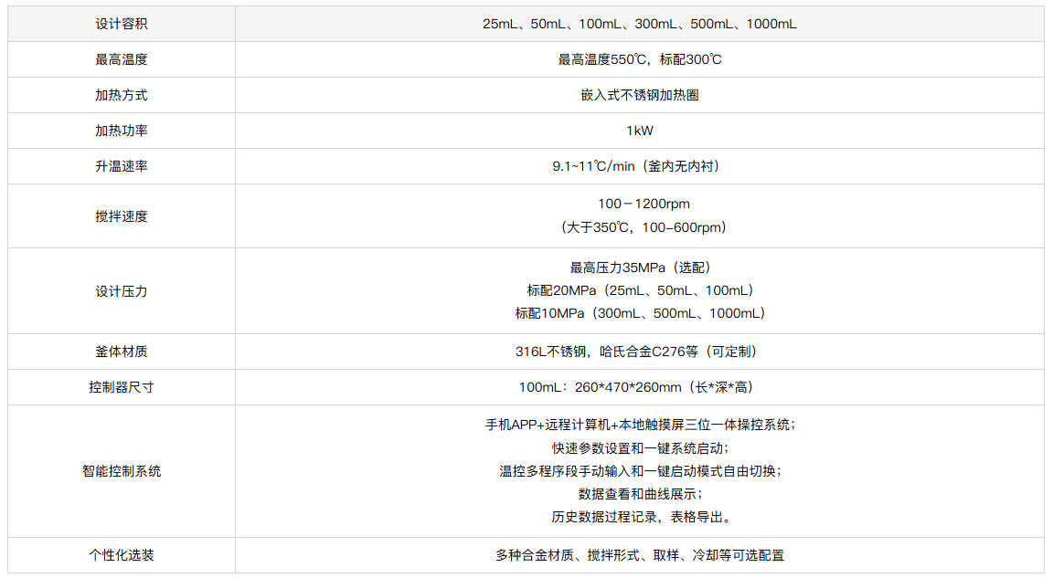 覆盖25mL~1000mL多种容积,提供316L不锈钢、哈氏合金等定制材质,支持搅拌形式、取样、冷却系统等个性化选装,是集安全性、智能化与操作便捷性于一体的实验室反应装备。